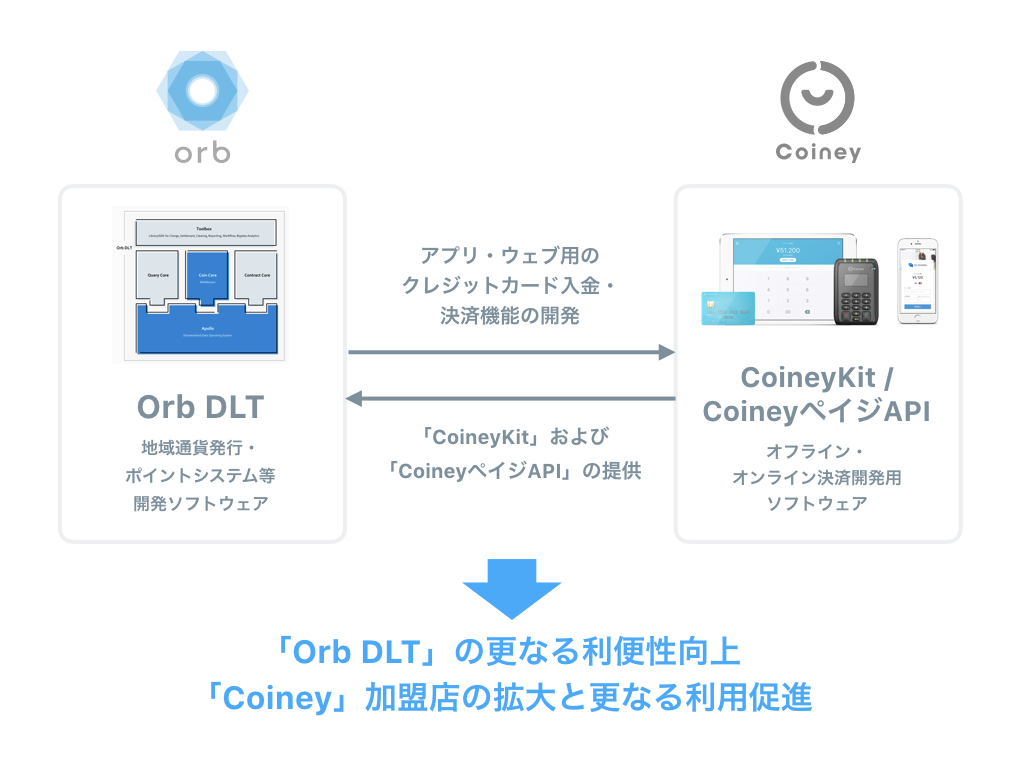 今回の協業でOrbは、地域通貨の発行やポイントシステム等を容易に・安価に提供することを可能にするソフトウェアである「Ord DLT」を提供します(「Orb DLT」のミドルウェア群である「コアシリーズ」は『決済』と『契約』をリアルタイムで処理する機能を有します)。一方コイニーは、ソフトウェア開発キット「CoineyKit」および「CoineyペイジAPI」を提供します。Orbは、「CoineyKit」「CoineyペイジAPI」を活用することにより、「Orb DLT」のデータ管理プラットフォームである「Apollo」、および「Orb DLT」のミドルウェア群である「コアシリーズ」を利用して、スマートフォン・タブレット端末およびオンラインでのクレジットカード入金・決済機能を顧客に提供します。
